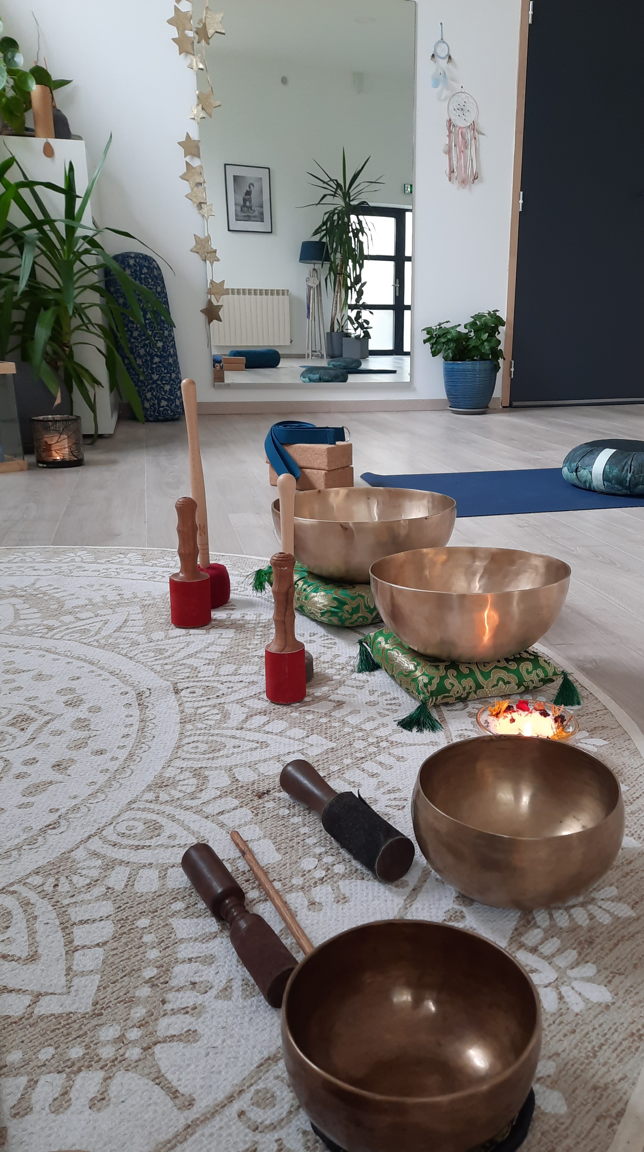 Vous vous allongez confortablement au sol, sur un tapis. Les bols sont placés autour de vous ou sur votre corps, afin de vivre au mieux cette expérience sensorielle immersive au centre des sons et des vibrations qui invitent à la relaxation et à l‘harmonisation intérieure.